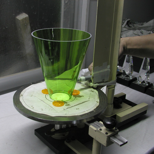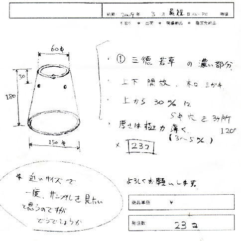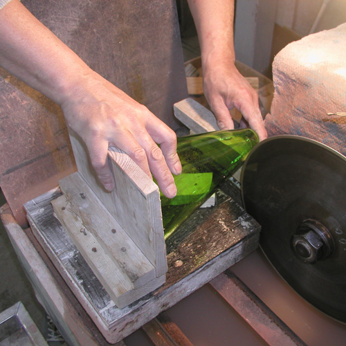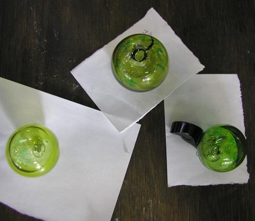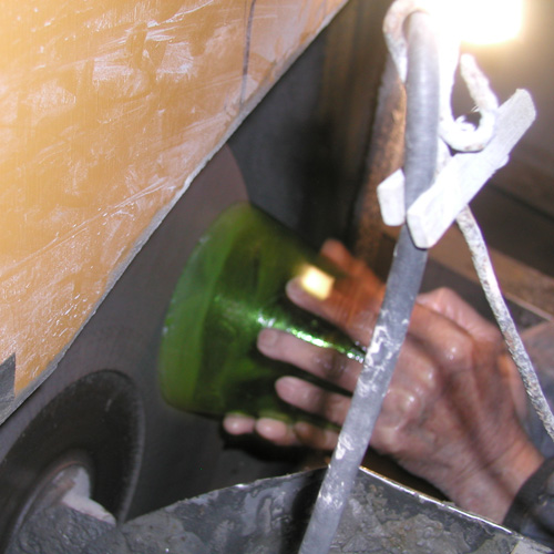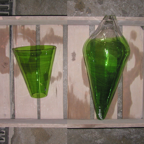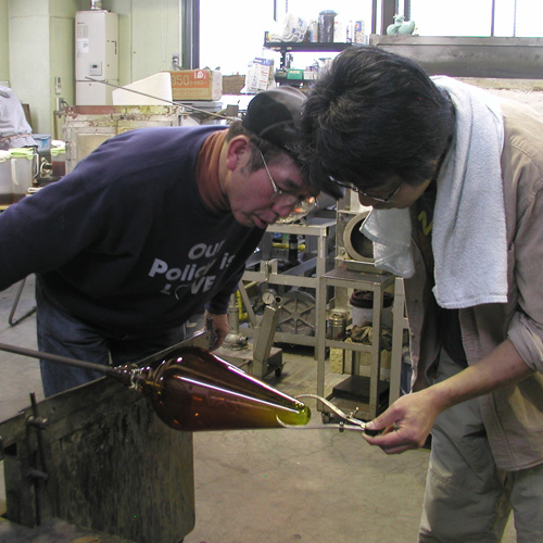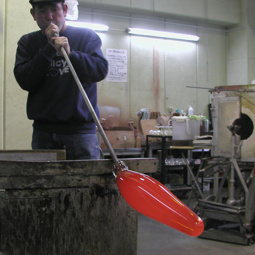 複数個を同じかたちできれいな円錐にするために型に入れて吹きながら成形していきます。 |
