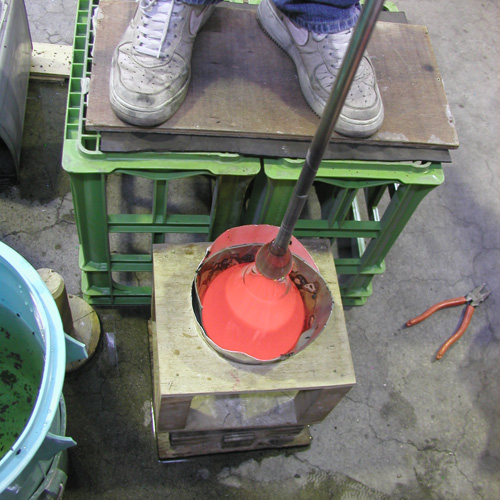 決まった色を溶かし、実際の製作に取りかかります。今回は円錐を切断することを想定し、完成よりも長めの円錐を作っていきます。 |